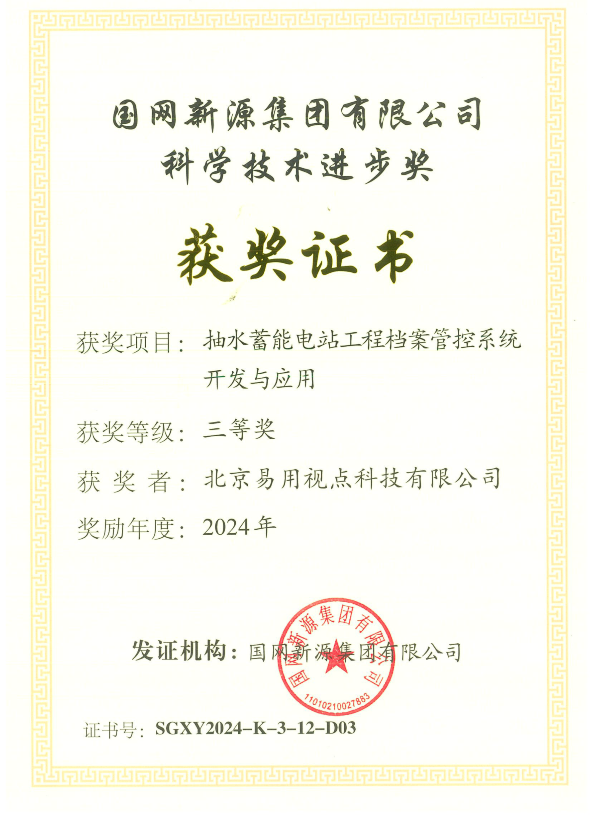 近日,行业捷报振奋人心!易用视点承担的抽水蓄能电站工程档案管控系统研究与开发项目,在国网新源集团有限公司2024年度科学技术奖评选中脱颖而出,成功斩获科学技术进步奖三等奖!