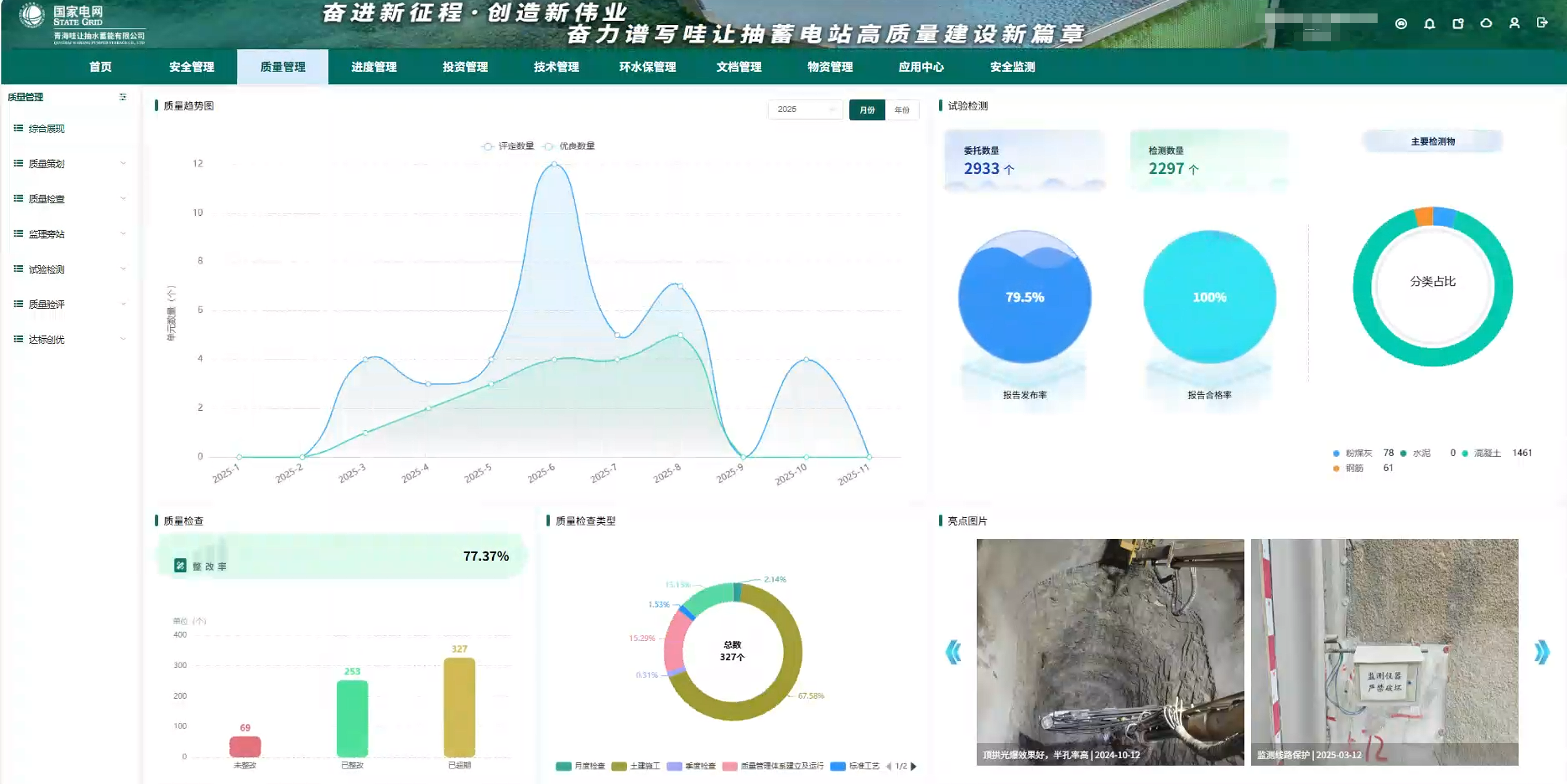 由易用视点承建的哇让数字化平台自2024年上线以来,质量管理模块完全实现质量标准化管理,强化原材料从进场检验到工序验收的全过程管控,严格执行“三检制”,做到业务线管理线双贯通,检测项目全覆盖、质量责任可追溯。通过业务信息及文件的自动化收集、汇总、统计分析,实现对施工现场重要环节和关键过程的有效管控,实现现场全面、全员、全过程、全方位应用,提升抽水蓄能工程质量管理数字化水平。